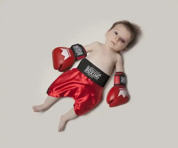 Фотография - участник проекта, в котором родители представляли образы своих детей и их профессии во взрослой жизни. Некоторые примеры изображают детей-юристов, врачей, военных и серферов, на этом же снимке - ребенок в образе боксера. Нарисованный под глазом малыша фингал (надеемся, он не настоящий) вкупе со слоганом проекта "Однажды он станет одним из них" не вызывает положительных эмоций.