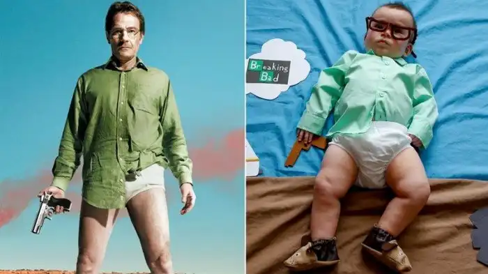Прототип - персонаж Уолтер Уайт из сериала "Во все тяжкие", занимающийся производством и продажей метамфетамина. На самом деле, это далеко не первый образ малышки Оливии (на фото): подруга ее мамы - Карен Абад, по совместительству фотограф, не зная как себя занять в течение нескольких часов с ребенком, решила переодеть девочку во множество известных образов - этот негативный персонаж вызвал у зрителей наибольшее возмущение.