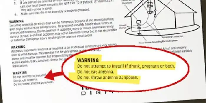 "Запрещено доверять установку лицам в состоянии алкогольного опьянения и беременным женщинам. Запрещено есть антенну. Запрещено бросать антенну в супруга/супругу"