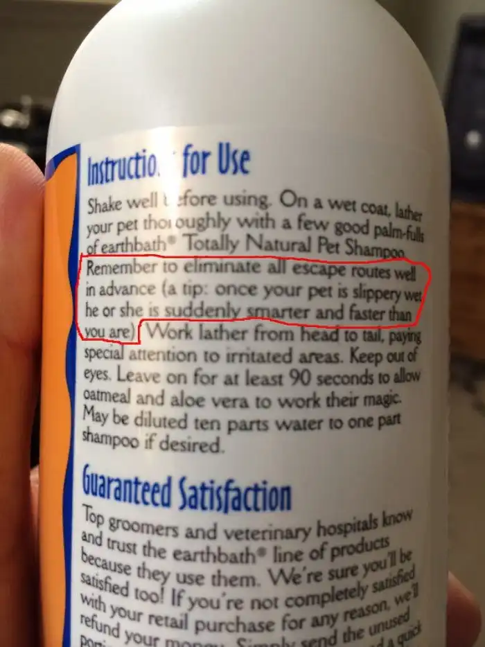 Шампунь для собак: "Перед купанием закройте все входы и выходы (ваше животное может оказаться умнее и проворнее вас во время купания)"