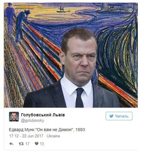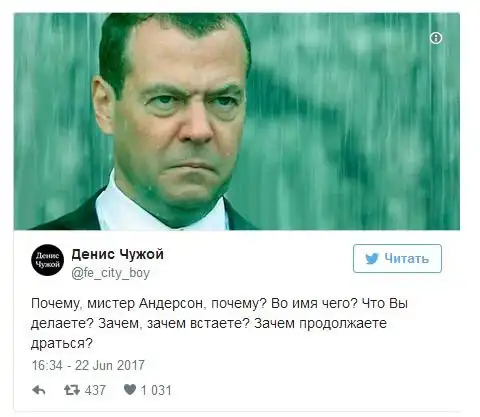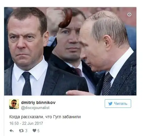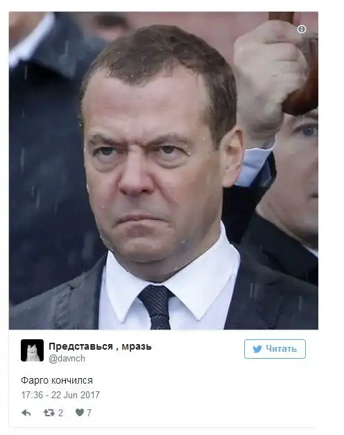 В День памяти и скорби, 22 июня, президент России Владимир Путин и премьер-министр Дмитрий Медведев приняли участие в церемонии возложения венков к Могиле Неизвестного Солдата в Москве. Во время мероприятия начался ливень, под который попали все, кто пришел на мемориал. Фотограф агентства Reuters Сергей Карпухин сфотографировал Дмитрия Медведева, а выражение его лица сразу же стало поводом для шуток и фотожаб.