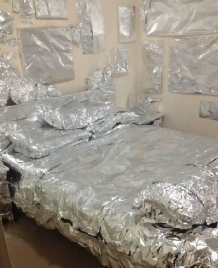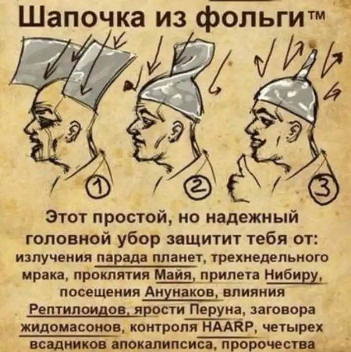 Шапочка из фольги! Защита от сигналов с космоса,от слежки правительства и промывки мозгов, не подпускает к вам свидетелей Иеговы так же как и нормальных людей,а так же останавливает голоса в вашей голове,не позволяет сверхъестественным силам контролировать вас!
