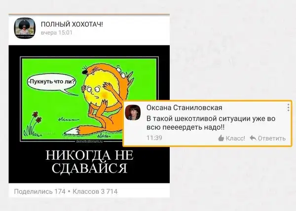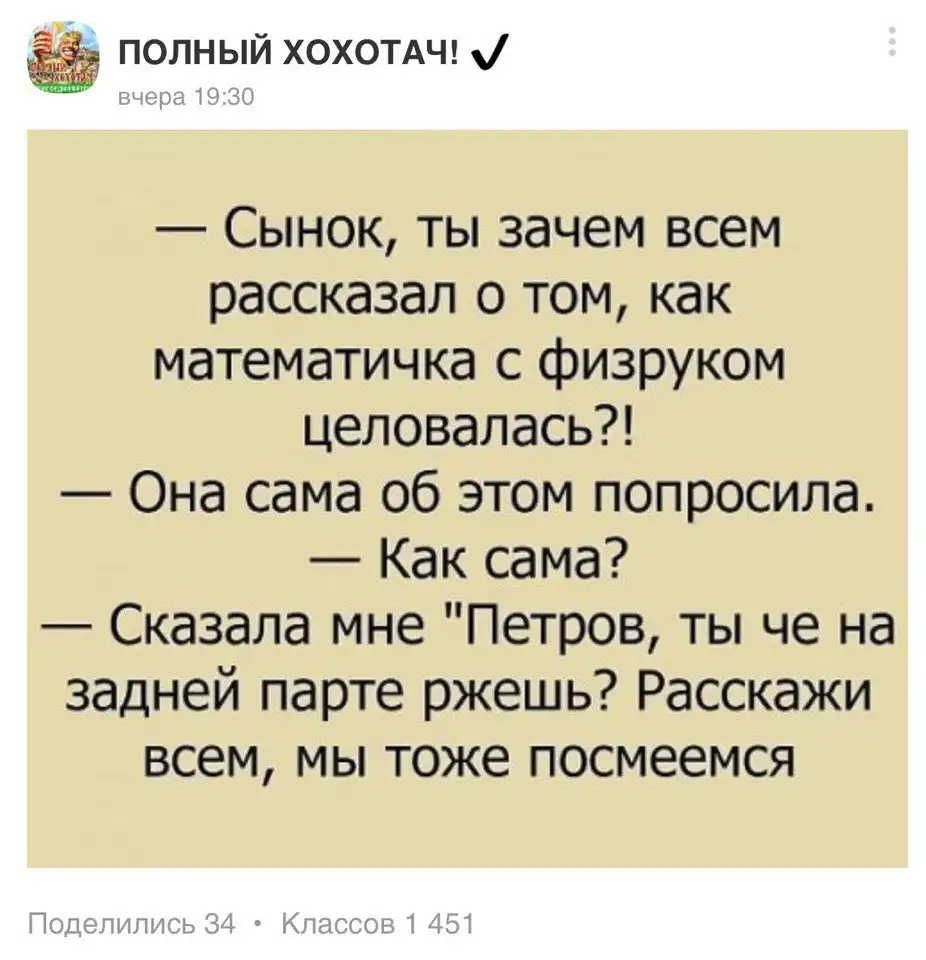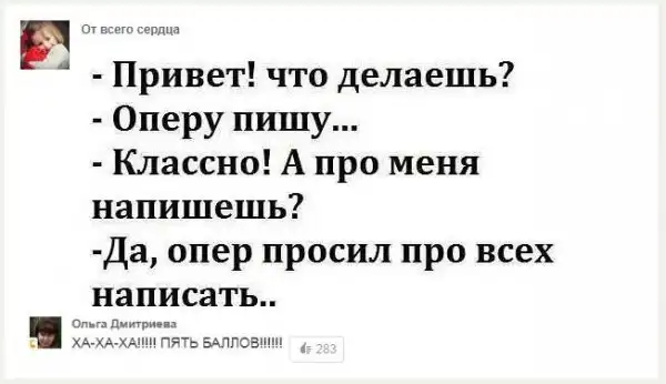 В подборке присутствуют: переписки, сообщения, фотографии, ну и просто анекдоты из ранее упомянутой соц. сети. :haha: