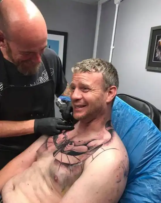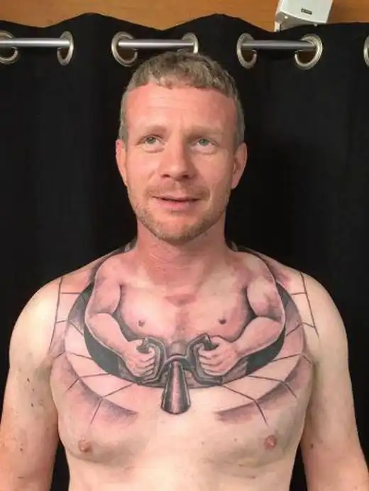 36-летний водитель грузовика Кенни Оллереншоу (Kenny Ollerenshaw) из Великобритании набил себе татуировку, фотография которой стала вирусной в сети. Снимок увидели более двух миллионов человек, большинство из которых посчитали татуировку забавной. На груди мужчины были изображены руки, которые держат штурвал, что действительно выглядит очень забавно.