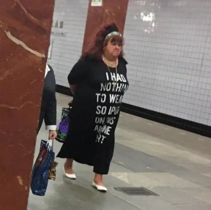 11. Надпись гласит: «Я не знала что надеть, потому пришлось нарядиться в эту ху*ню»