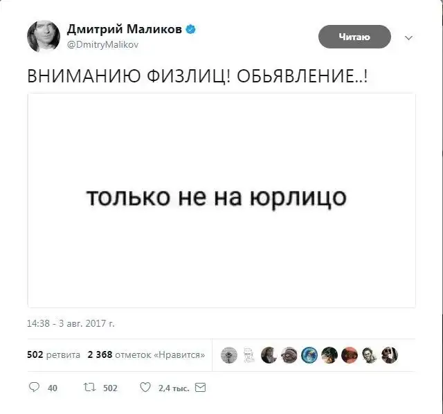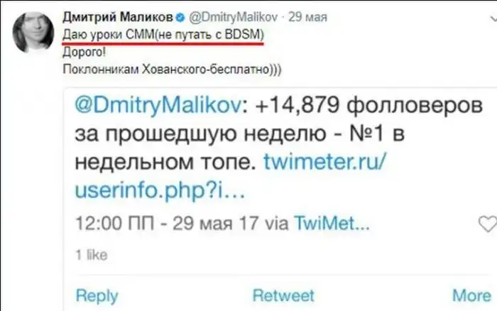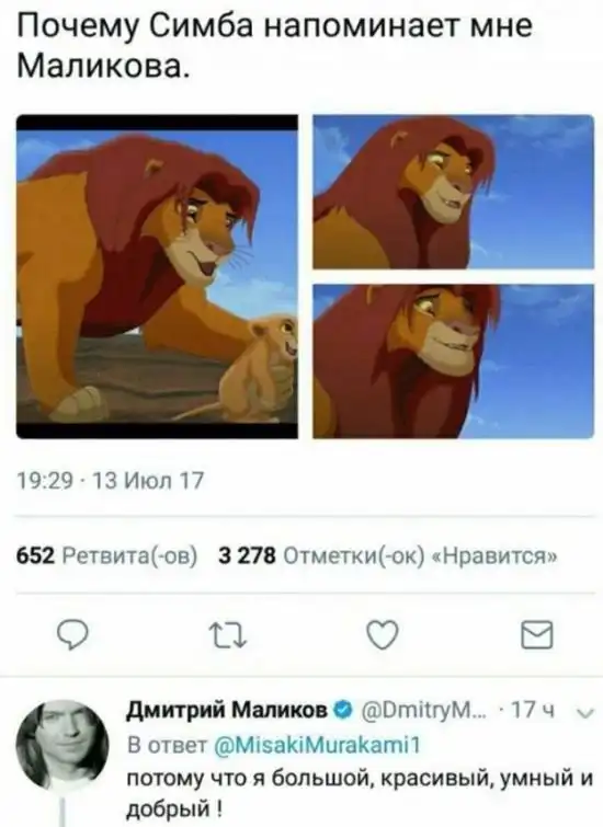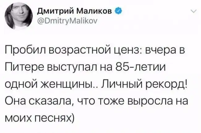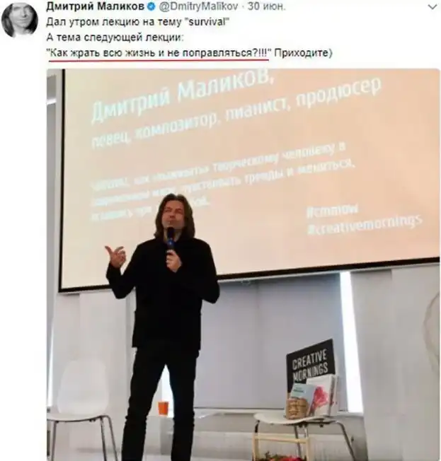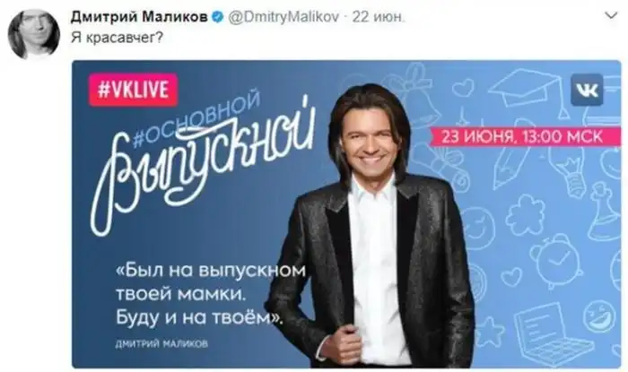 Российский певец и композитор Дмитрий Маликов обладает неплохим чувством юмора, о чем свидетельствует его страница в социальной сети "Твиттер". 47-летний мужчина сам ведет свой аккаунт, на который подписаны более 650 000 человек. Его страница наполнена постами, излучающими доброту, а иногда и иронию, из-за чего они моментально становятся настоящими "хитами" Рунета.