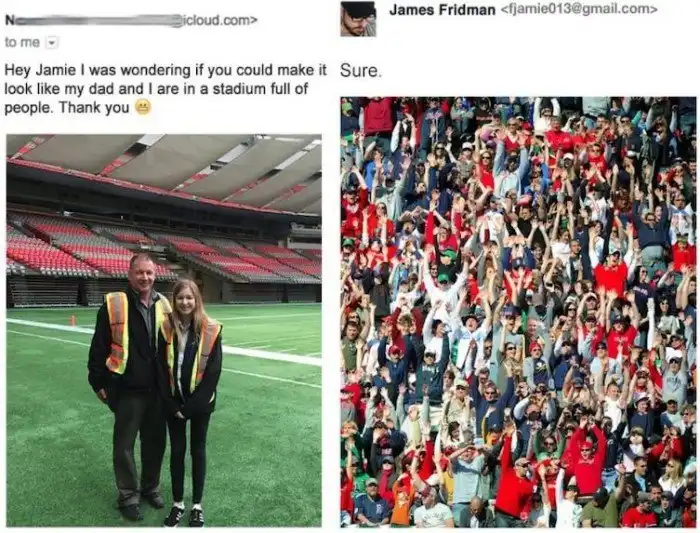 "Джеймс, представь, пожалуйста, дело так, как будто мы с папой находимся на стадионе, полном народа. Спасибо!"
