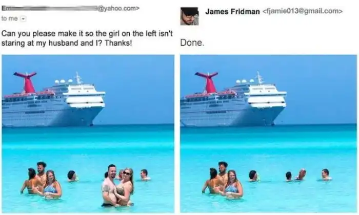 "Джеймс, а сделай так, чтобы эта девушка слева не пялилась на нас с мужем!"