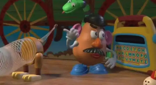 В третьей части «Истории игрушек» после того, как кто-то украл рот жены мистера Картошки, он делает неопределенные движения, и на табло рядом с ним появляется намекающий на шутку текст. В силу своей осведомленности каждый интерпретирует значение данного жеста по-своему.