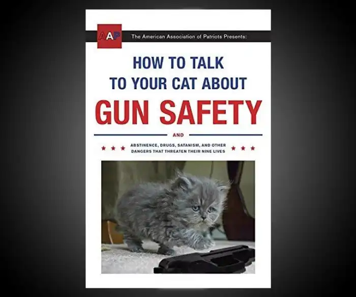 ...а также о воздержании, наркотиках, сатанизме и других опасностях, угрожающих его девяти жизням. Авторы книги отвечают на самые популярные вопросы любителей кошек: "В каком возрасте котенка надо научить безопасному обращению с оружием?", "Почему моя кошка должна пользоваться интернетом?" и "Как моему коту не попасть под влияние сатанистов?". Книга создана вымышленной Американской ассоциацией патриотов, чья задача защита кошек США от врагов.
