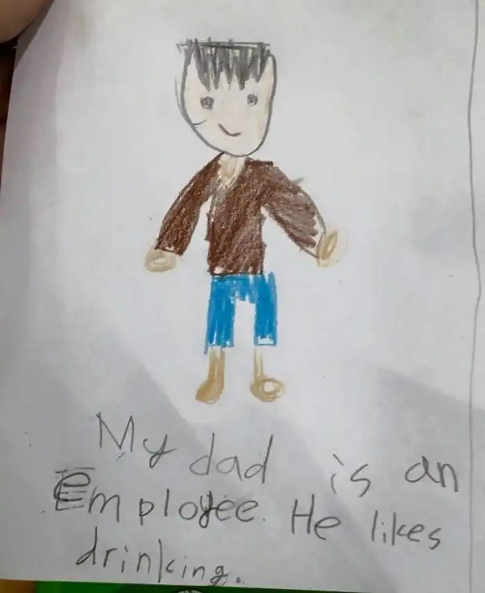 "Моему папе 8 лет. У него хорошо получается чинить вещи. Его любимая еда - пиво. Он смешной, когда пукает. Мы любим вместе ходить в магазин "Все за 1 доллар". Я люблю его, потому что он кормит моих рыбок"