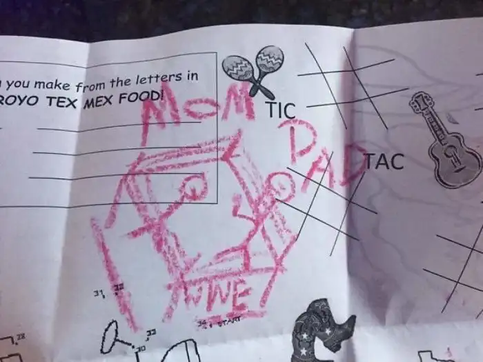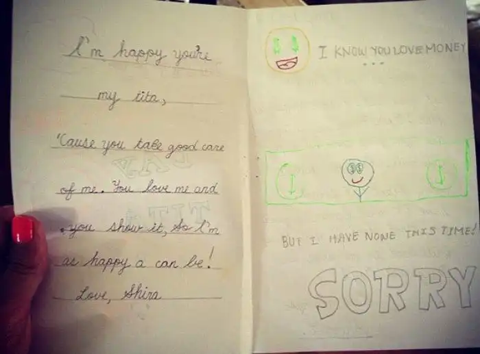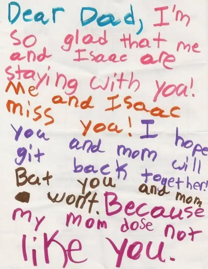 "Дорогой папа, я так рада, что мы с Исааком остаемся с тобой! Мы с Исааком скучаем по тебе! Надеюсь, что вы с мамой снова будете вместе! Но вы не будете. Потому что ты не нравишься моей маме".