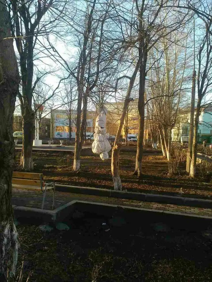 Не перевелись еще люди, который смеются смерти в лицо. Так креативно они собирают листву в мешки