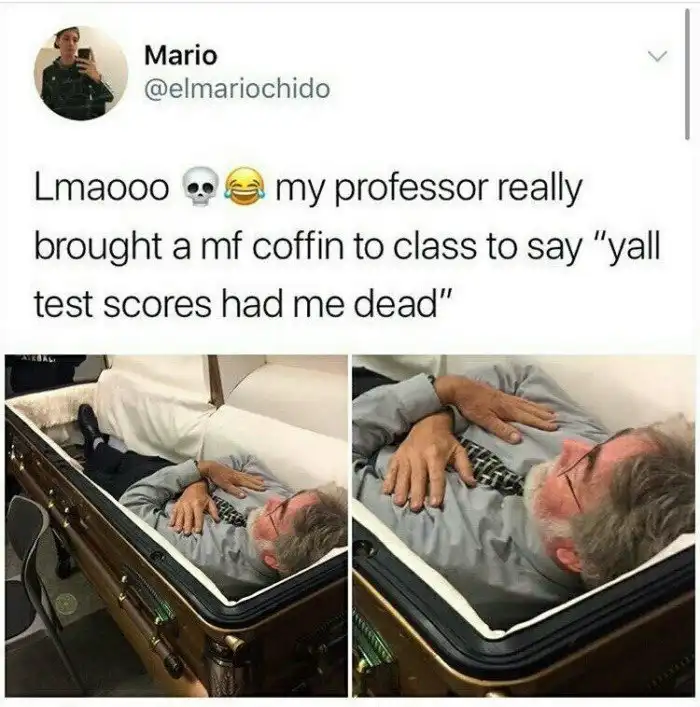 "Мой профессор в колледже реально принёс на пару гроб, чтобы сказать, что наши результаты теста его убили"