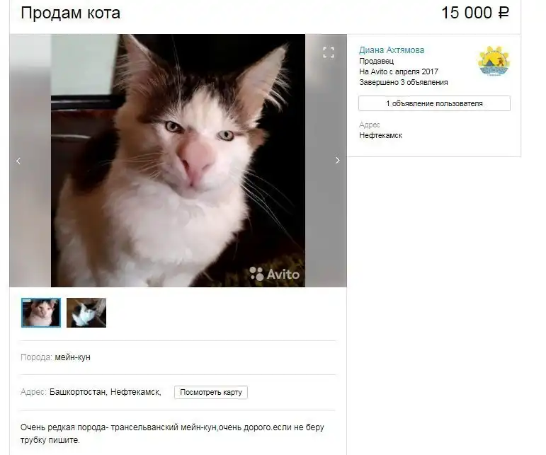 «Очень редкая порода- трансельванский мейн-кун, очень дорого, если не беру трубку пишите», – написал продавец (орфография сохранена).