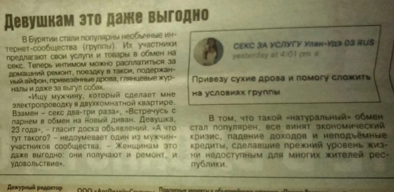 Проститутки согласны даже на бартер, чтобы прокормить себя и своих близких. Подобные объявления - не редкость