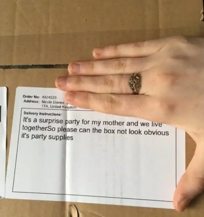 "Делая заказ, я написала в примечании: "Я заказываю оформление и атрибутику для вечеринки-сюрприза, которую мы готовим для мамы. Но мама живет вместе с нами, поэтому, пожалуйста, запакуйте посылку так, чтобы было незаметно, что это вещи для праздника". Так они, идиоты, крупно распечатали это примечание и наклеили прямо на верхнюю часть посылки!"