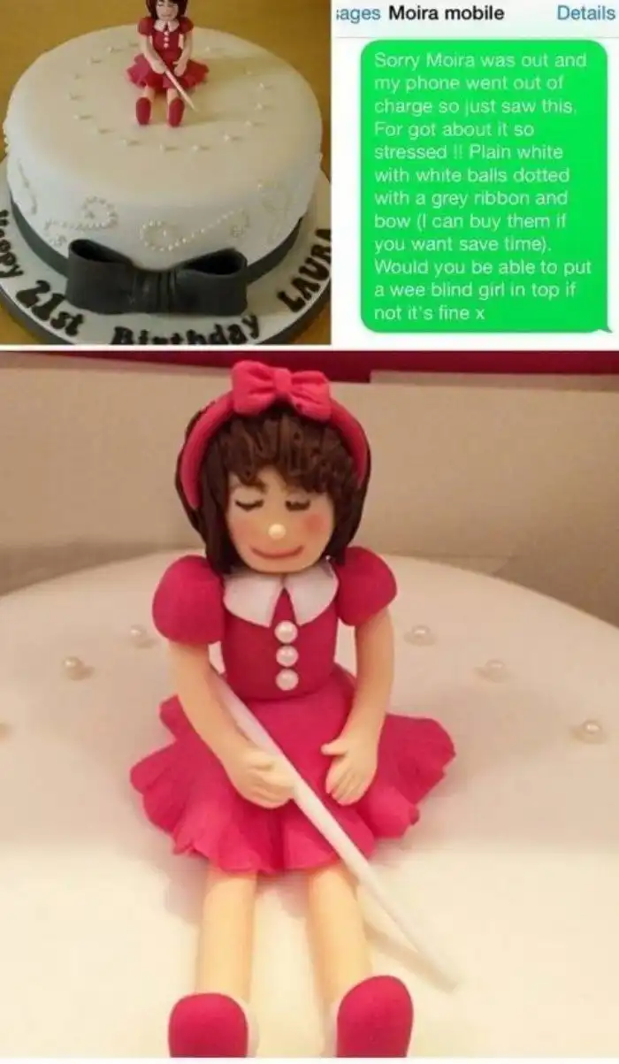 "Мама заказывала в интернете именинный торт для моей сестренки, попросила украсить его фигуркой маленькой белокурой (blond) девочки. Но опечаталась в одной букве и, в итоге, заказала фигурку маленькой слепой (blind) девочки. И вот что сестренка получила на праздник!"