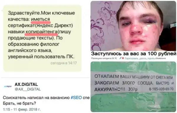 На рынке труда все чаще мелькают неграмотные резюме и бредовые вакансии. Как говорится: какой работодатель, такой и соискатель. Условия, а также заработная плата, как правило, прямо пропорциональны профессионализму сотрудника. В противном случае получаются картинки из нашей подборки.