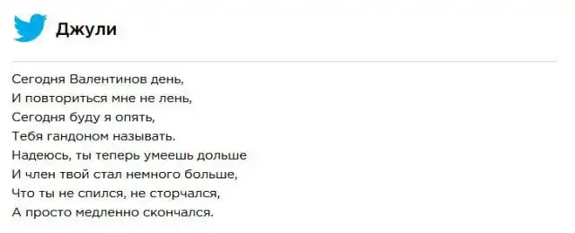 Одними из самых популярных посланий в русскоязычном Твиттере стали те, которые пародируют царящую в День всех влюбленных обстановку любви и добра. Авторы оставляют твиты, передающие противоречивые чувства по поводу своих расставаний с любимыми.
