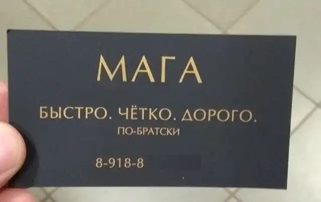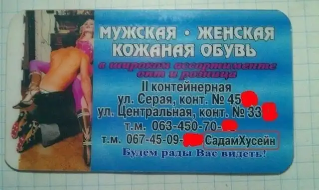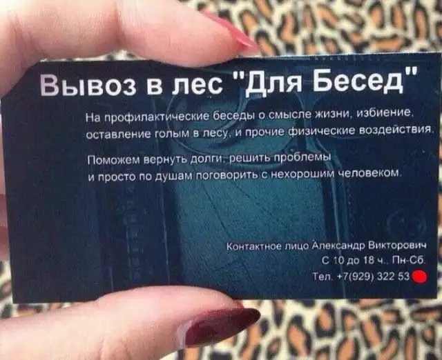 Можно коллекционировать визитки различных предприятий и сервисов обслуживания. На них и красивый слоган, и многообещающие предложения, и дизайн красочный с цветочками всякими. А порой встречается и подобное чудо-искусство. Без юмора в этой жизни – ну никак.