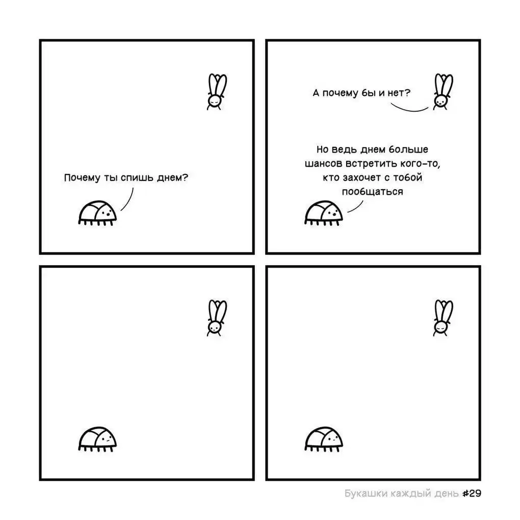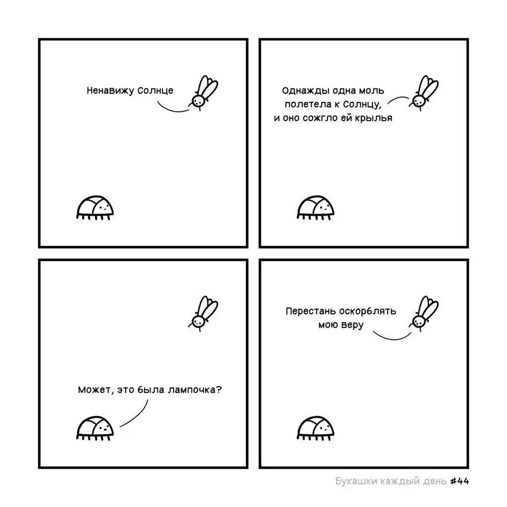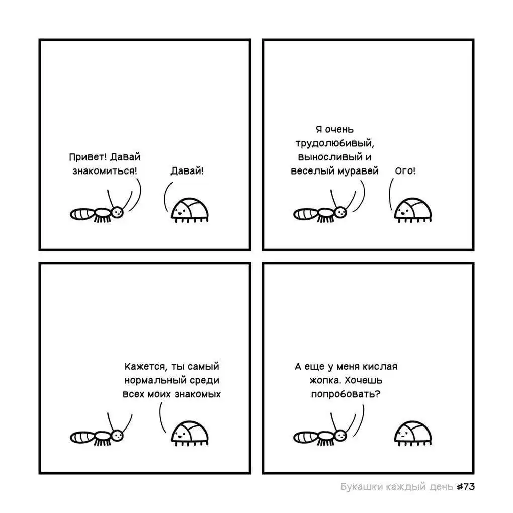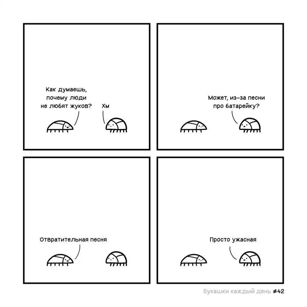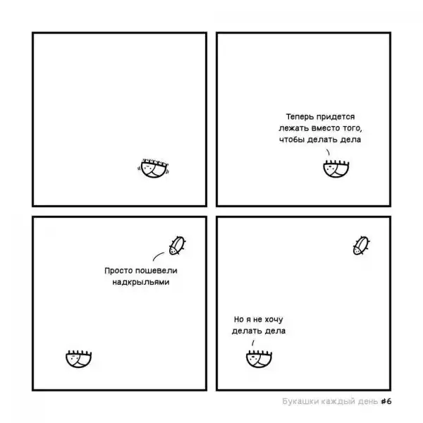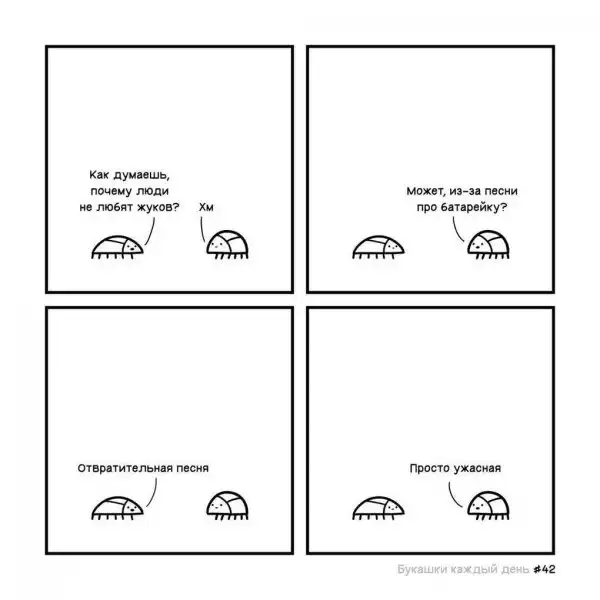 Изначально автор назвал свой проект «Букашки каждый день», но что-то пошло не так, и из-за загруженности он не успевал выпускать картинки ежедневно. Эти иллюстрированные истории больше напоминают мини-сериал, где жучки ежедневно сталкиваются со своими насекомыми проблемами, которые порой оказываются очень похожими на человеческие, и решают их лаконично и с очень тонким юмором.