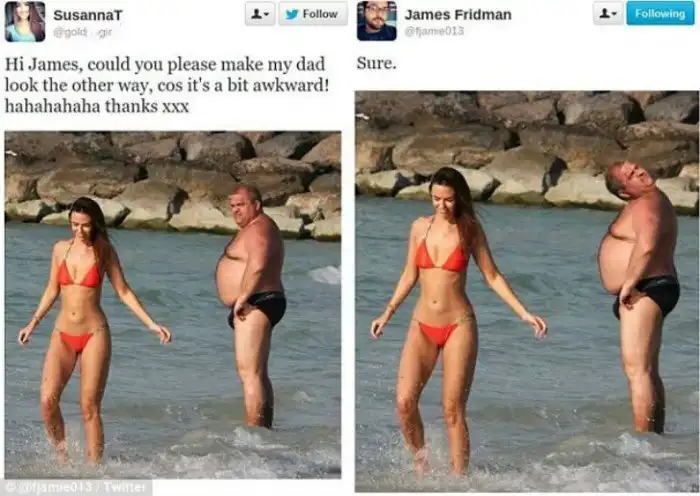 Девушка прислала фотографию слева с просьбой «убрать ненавистное чудовище, которое испортило весь кадр». Джеймс и убрал