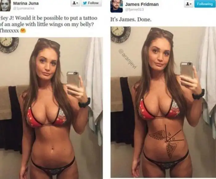 Просьба: «Можно ли нарисовать татуировку угла с крыльями?» (Очевидно, девушка сделала ошибку в слове «angel» («ангел»), написав «angle» («угол»)