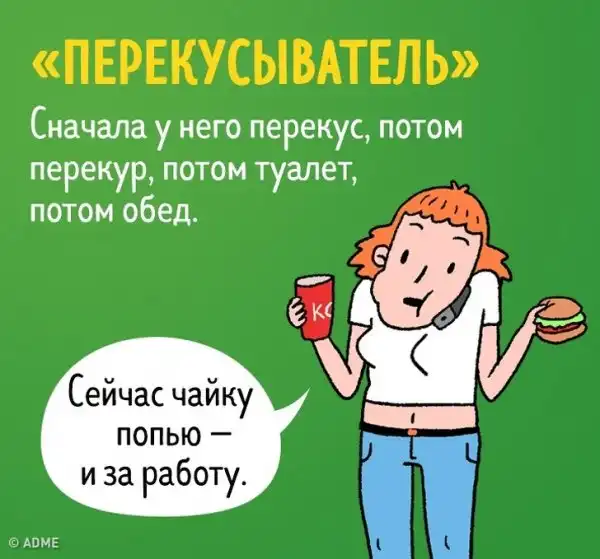 Работа — это отдельный мир, в котором мирно (а иногда и не очень) трудятся люди ради общего дела. И порой, взглянув на свой коллектив, понимаешь, что каждый из коллег прилетел со своей планеты и абсолютно каждый — тот еще персонаж. Но есть определенные типы людей, которых можно встретить почти в любом офисе.