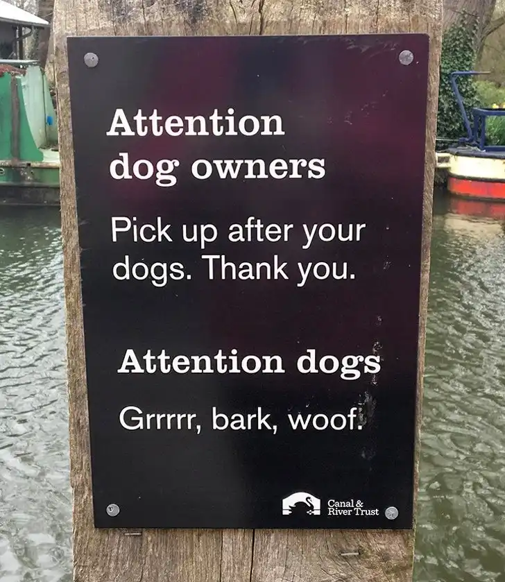 «Вниманию владельцев собак: убирайте за своими питомцами. Спасибо». «Вниманию собак: Рррр, гав, вуф».