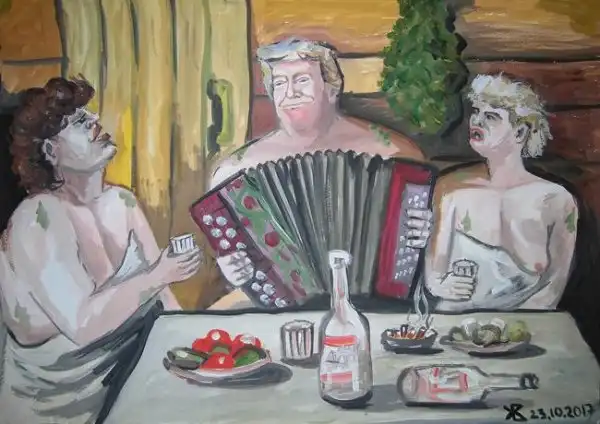 Иллюстрированные фантазии художника Вячеслава Жданова о казаке Дональде Трампе и его жизни в России.