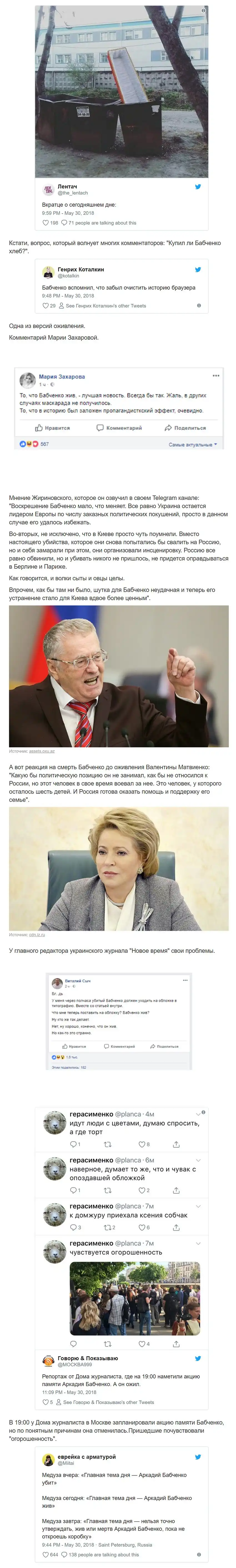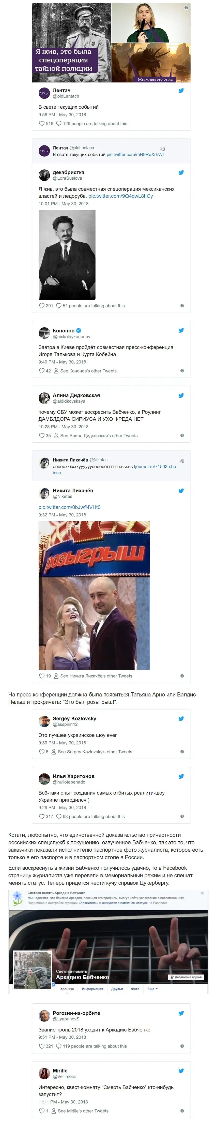 Воскреснуть в эпоху интернета - это случай особый. О таком даже не мечтал Том Сойер, ведь ему удалось послушать лишь несколько траурных речей земляков, набившихся в небольшую церковь, а у Бабченко был целый день, чтобы листать ленты соцсетей и читать некрологи про себя любимого. Теперь обо всем по порядку.