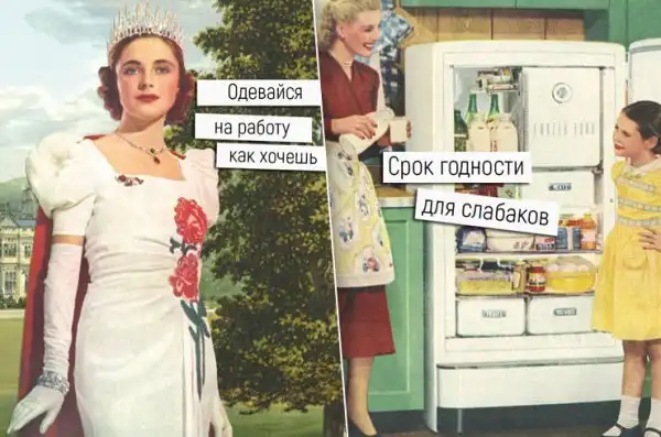Помните всех этих красавиц из женских журналов, которые встречают мужа вечером с улыбкой, свежей укладкой и готовым ужином? Всех этих сахарных женщин, какими хотело видеть общество женщин 60-х? А теперь взгляните, как забавно выйдет, если добавить к этим устаревшим изображениям современные подписи.