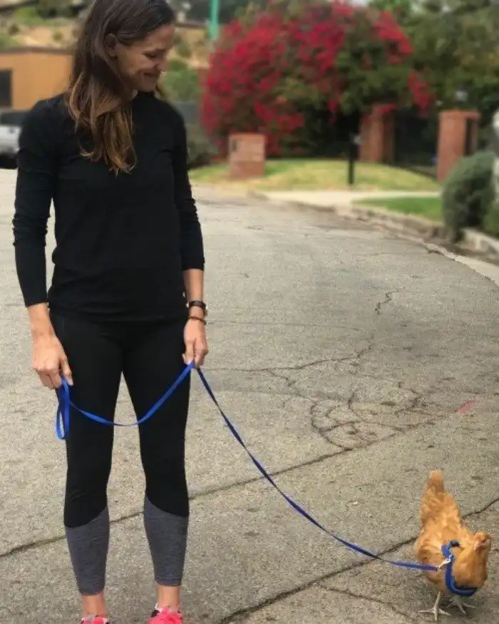 11. Дженнифер Гарнер выгуливает свою курицу на поводке