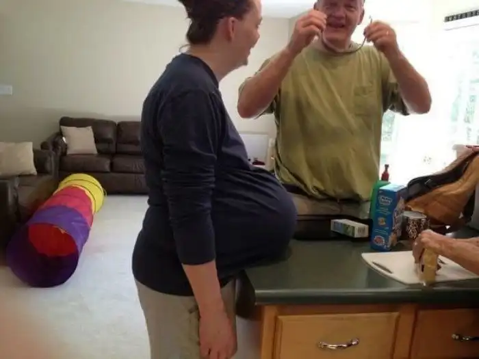 "Это я на восьмом месяце пытаюсь как-нибудь поудобнее устроиться и поспать - например, между диваном и кофейным столиком, как здесь".