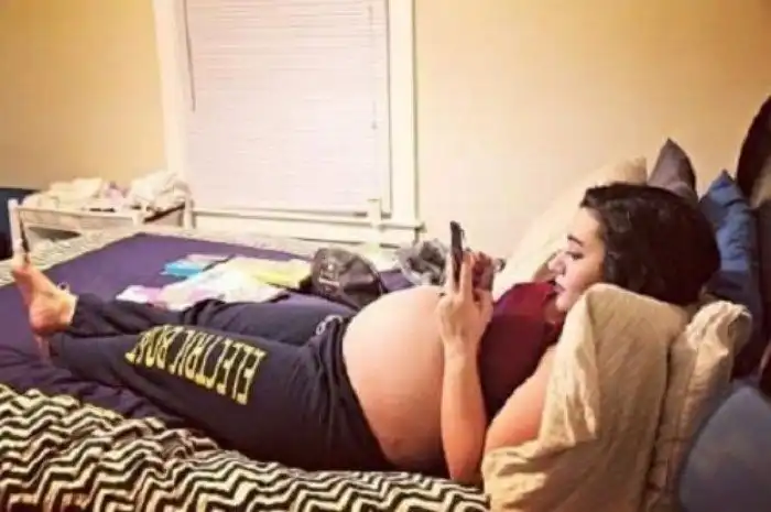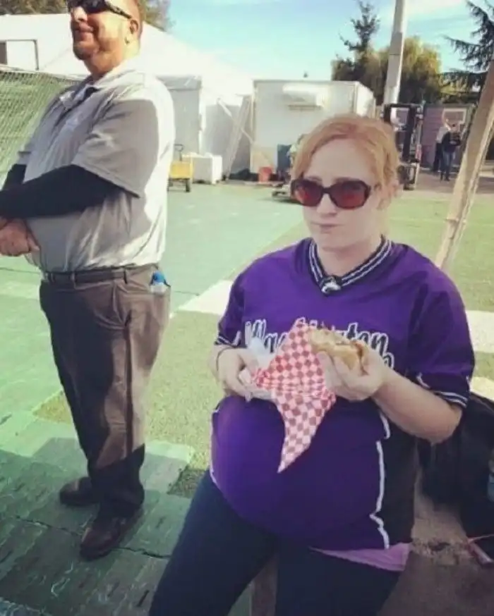 "В предполагаемый день родов я пришла посмотреть на игру футболистов нашего колледжа. Я постоянно хотела писать и есть. Охранник изумился, глядя, как я буквально всосала этот сэндвич".