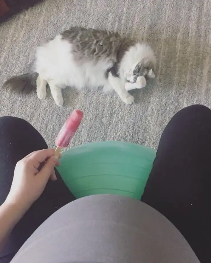 "Последние недели беременности. Устраиваюсь поудобнее: сама сажусь на резиновый массажный мяч, между ног прикладываю пакет со льдом.