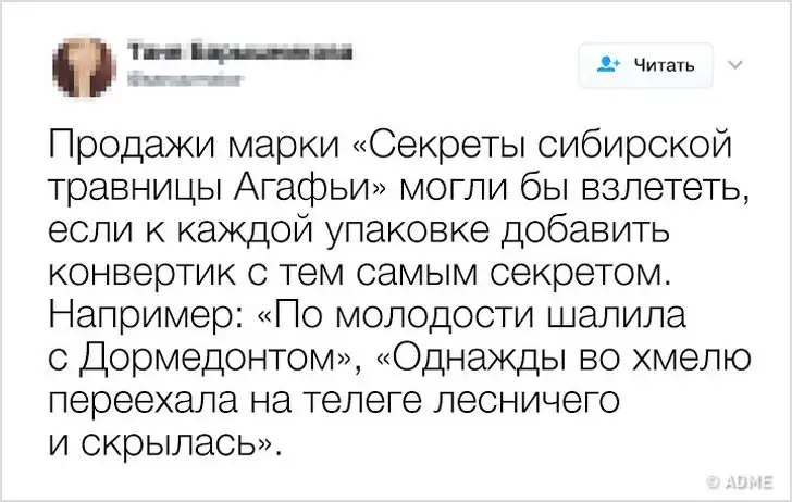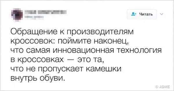 Твиттер не перестает нас радовать остроумными сообщениями, и мы ему за это очень благодарны. Ведь наша статья пополнилась такими шедеврами, как рассказ о секретах сибирской травницы или криком души к производителям кроссовок. Заинтригованы?