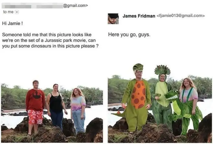 4. «Мне сказали, что мы выглядим как на съёмках «Парка Юрского периода», так что добавишь сюда динозавров?»