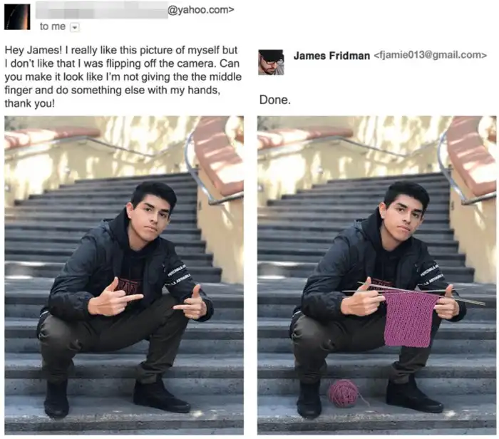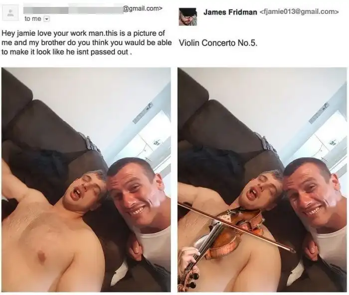 9. «Вот фото меня и брата, как ты думаешь, ты сможешь сделать так, чтобы не казалось, что он отключился?»