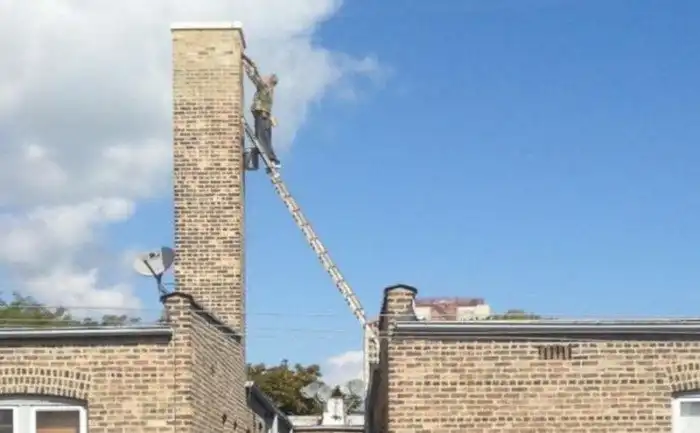 Всё в порядке, чувак снизу придерживает лестницу, беспокоиться не о чем