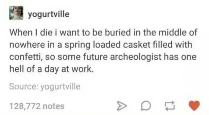 yogurtville: Когда я умру, хочу, чтобы меня похоронили где-нибудь в жуткой глухомани в гробу, наполненном конфетти, и крышка которого распахивалась бы под действием пружин, чтобы у какого-нибудь будущего археолога на работе выдался тот еще денек.
