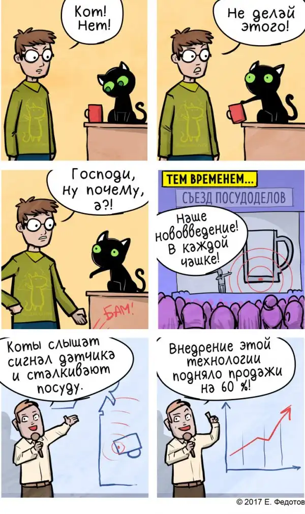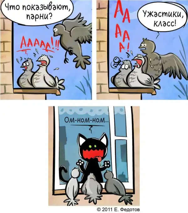 Художник из Москвы Евгений Федотов создает сетевой комикс «Кошки-мышки» уже более 9 лет. Его творчество понравится любителям мягкого, ничуть не пошлого юмора, легкой иронии и ненавязчивой житейской философии. Котовладельцы получат дополнительную порцию удовольствия, узнавая повадки своего питомца и находя неожиданные ответы на извечные вопросы, зачем он так делает и о чем он вообще думает.