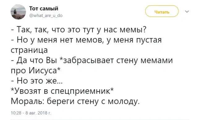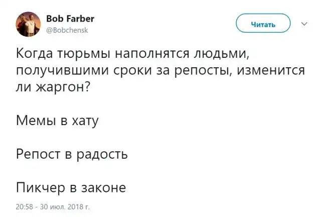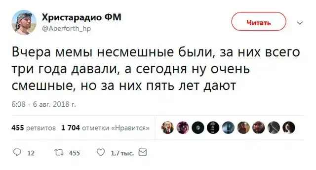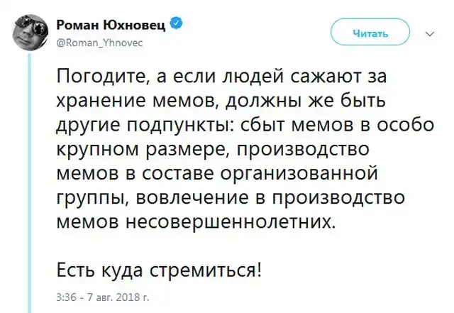 В России практически ежедневно стали появляться новости об арестах и задержаниях за мемы и даже лайки в социальных сетях. Кто-то уже задумывается об удалении персональных страничек и профилей из сети, а кто-то наоборот решил бороться с такими новостями при помощи ироничных шуток и мемов по этому поводу. Но тем не менее, слишком весело от них все равно уже не становится. Что самое интересное, получить уголовную статью можно как за репост мема, текстовую шутку, так и даже за историческую фотографию.