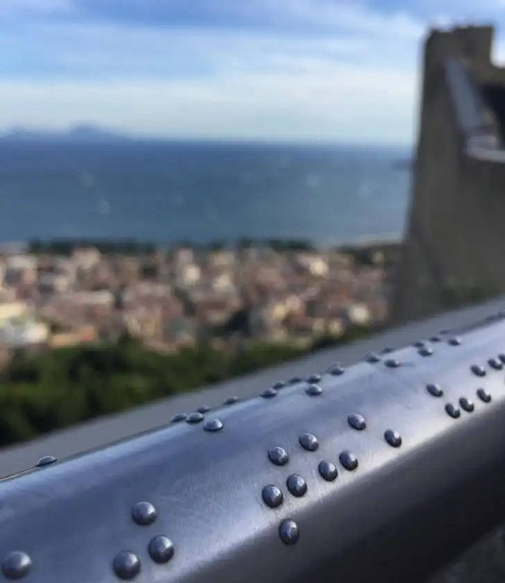 Шрифт Брайля, нанесенный на эти перила, описывает вид на Неаполь