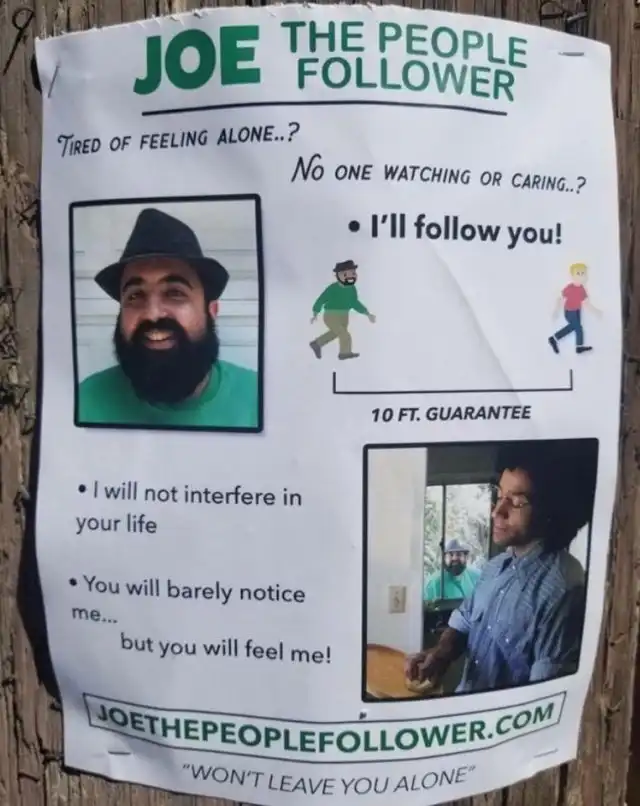 Если вы устали от одиночества, тогда этот парень сможет предоставить вам очень необычные услуги. За определенную плату он будет всегда следовать за вами, но не вмешиваться в вашу личную жизнь. По его словам, он предлагает услуги ненавязчивого сталкеринга, которые помогут вам почувствовать, что о вас всегда кто-то заботится и присматривает за вами.