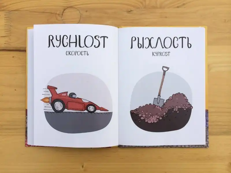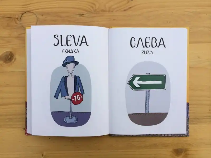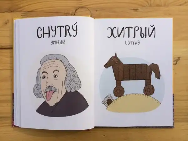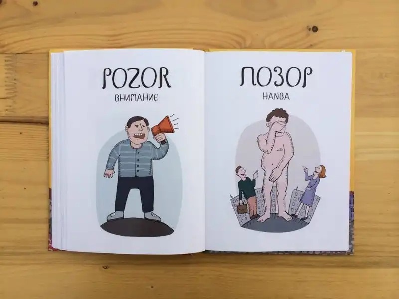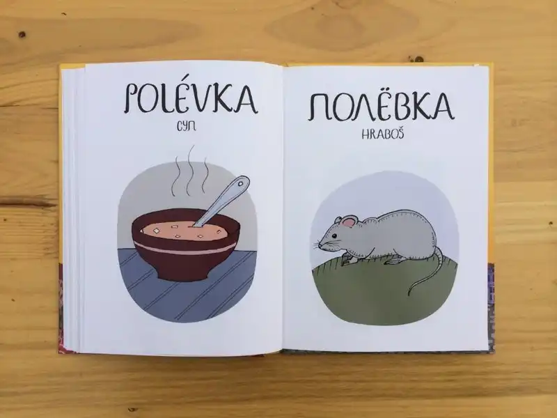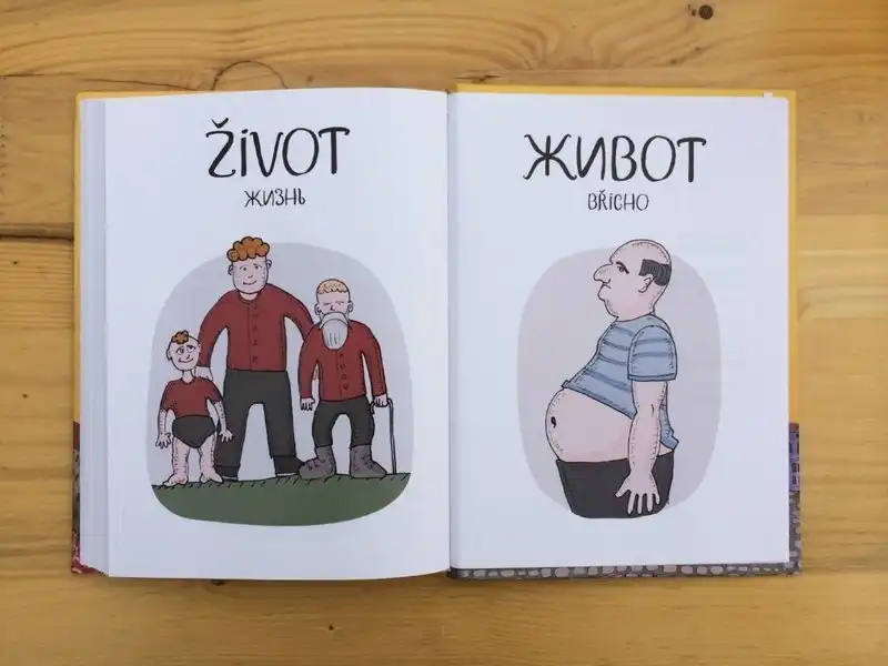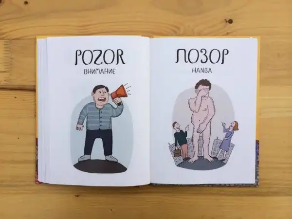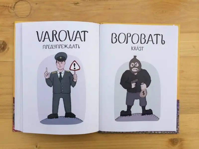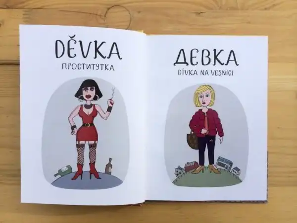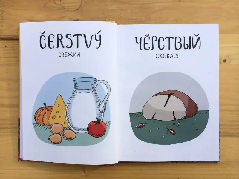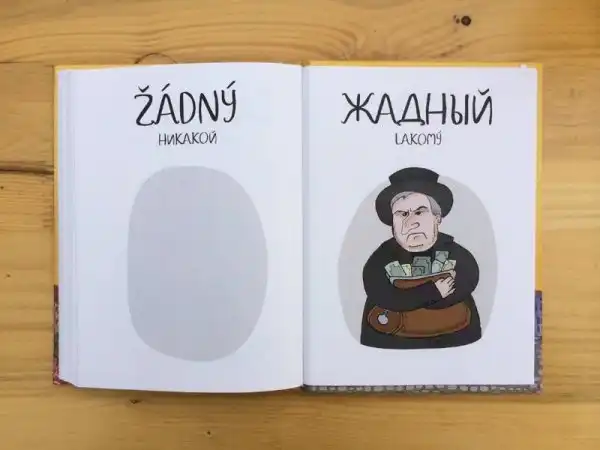 В словарике собрали 26 пар слов из русского и чешского языка, которые пусть и читаются аналогично, порой имеют совершенно непредсказуемый перевод. К таким словам-близнецам создали забавные иллюстрации.