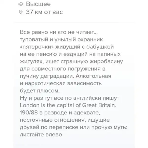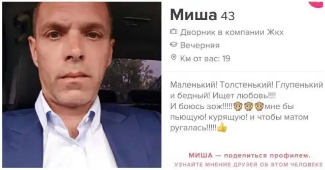 Некоторые люди, видимо, настолько уже устали от поиска второй половинки, что решили создать свои профили на сайтах знакомств. В этом посте мы собрали для вас самые суровые объявления и отчаянные анкеты с различных сервисов знакомств, которые точно заставят вас улыбнуться.