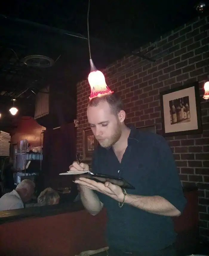 «Наш официант устал постоянно врезаться головой в лампочку и нашёл такое решение»