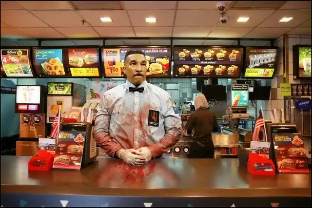 Из-за рассечения у бойца он стал похож на маньяка с руками по локоть в крови (ну или на не очень аккуратного мясника).